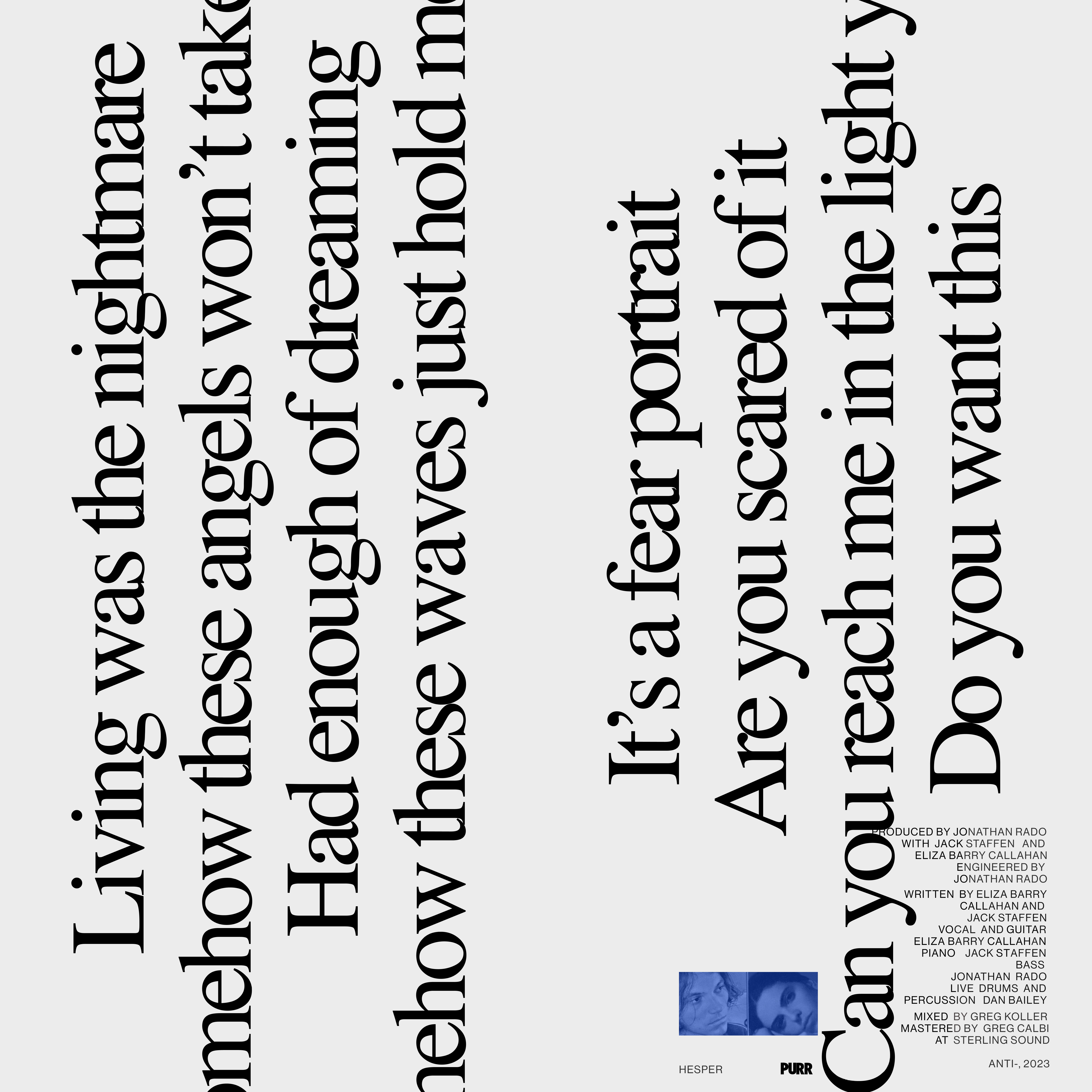 A timeless power ballad anchored by a simple classic 80s Linn drum, Purr’s new track ”Hesper” opens wide into a sparkling expanse that is equal parts shoe gaze and star gaze. At once theatrical and slightly sedated, it’s Kate Bush on Ketamine —-with a lilting vocal by Eliza Barry Callahan at center.